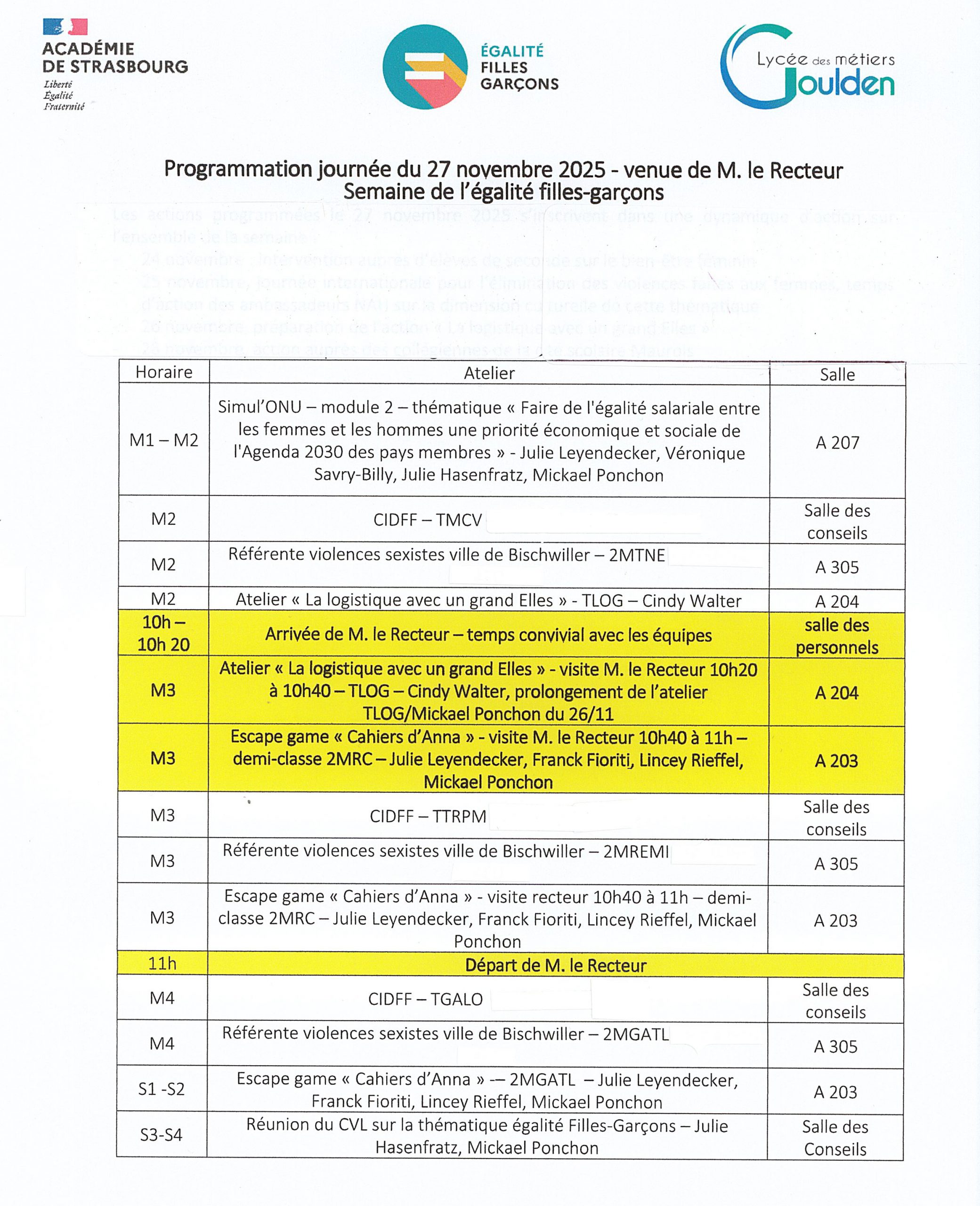 – Jeudi 27 novembre, journée de l’égalité : visite de Monsieur le Recteur d’Académie entre 10h00 et 11h00, présentation du Label Égalité Fille/Garçon et ateliers tout au long de la journée